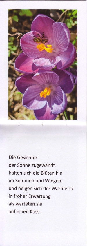Kalender-Booklet, fadengebunden, hochkant, 12 Doppelseiten, jeweils mit Foto und Text, Din A7 (7.4×10.5cm)