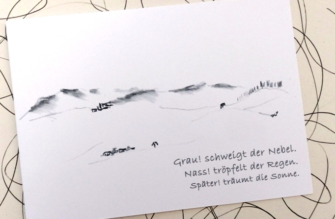 Zu diesem Vordermotiv gibt es eine ganze Serie »Nebelspatzen« mit verschiedenen Innen-Motiven und fröhlichen Grußtexten, außerdem eine zweite Serie »Spat-Zen« mit Schnee-/Eis-Motiven. Fragen Sie bei Interesse gerne nach.