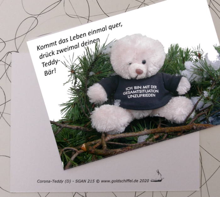 Aufmunterung, weißer Knuddel-Teddy, mit weißem Spruch auf schwarzem T-Shirt vor Kiefernzweig mit Schnee